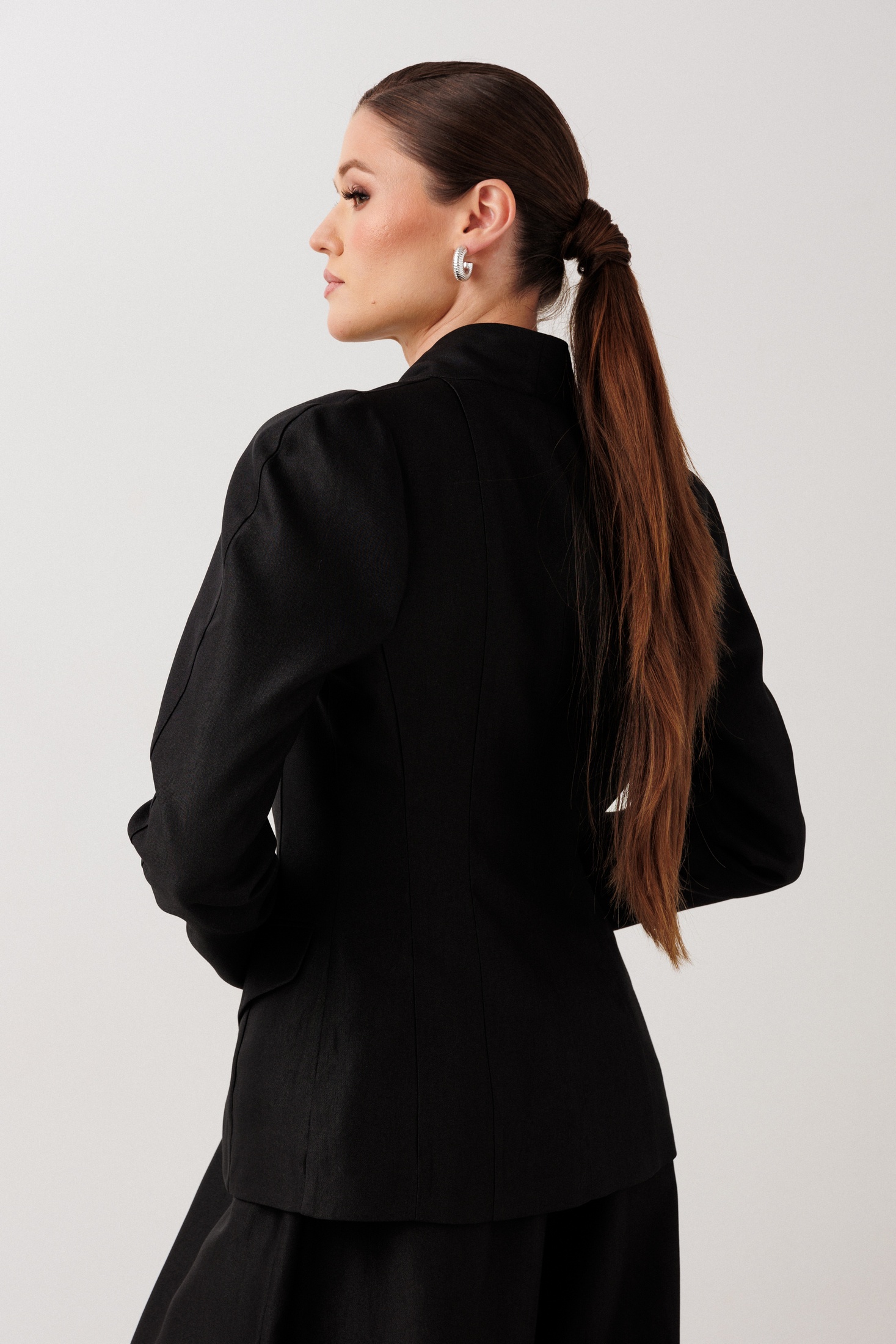 Жакет 1004 ERTANNO — стильное решение для современного гардероба. Коллекция бренда ERTANNO предлагает приталенный жакет из 46% вискозы, 40% полиамида и 14% полиэстера с подкладкой на 100% из вискозы. Материал обеспечивает комфорт и легкость, подчеркивая силуэт. Центральная застежка на пуговицу и цельнокроеный воротник-стойка придают модели лаконичность. Длинные рукава полуреглан украшают пуговицы и шлица, добавляя утонченности. Этот жакет черного цвета отлично подойдет для деловых встреч и повседневных элегантных образов в осенне-зимний сезон. Идеальная посадка и гладкий материал создадут уверенность в каждом движении. Параметры модели: рост-175см, 82-67-91