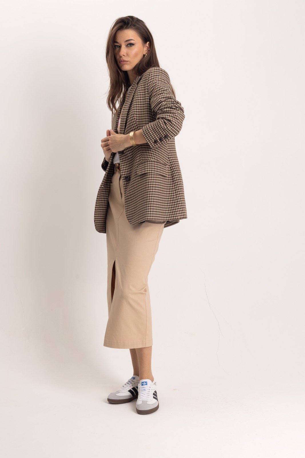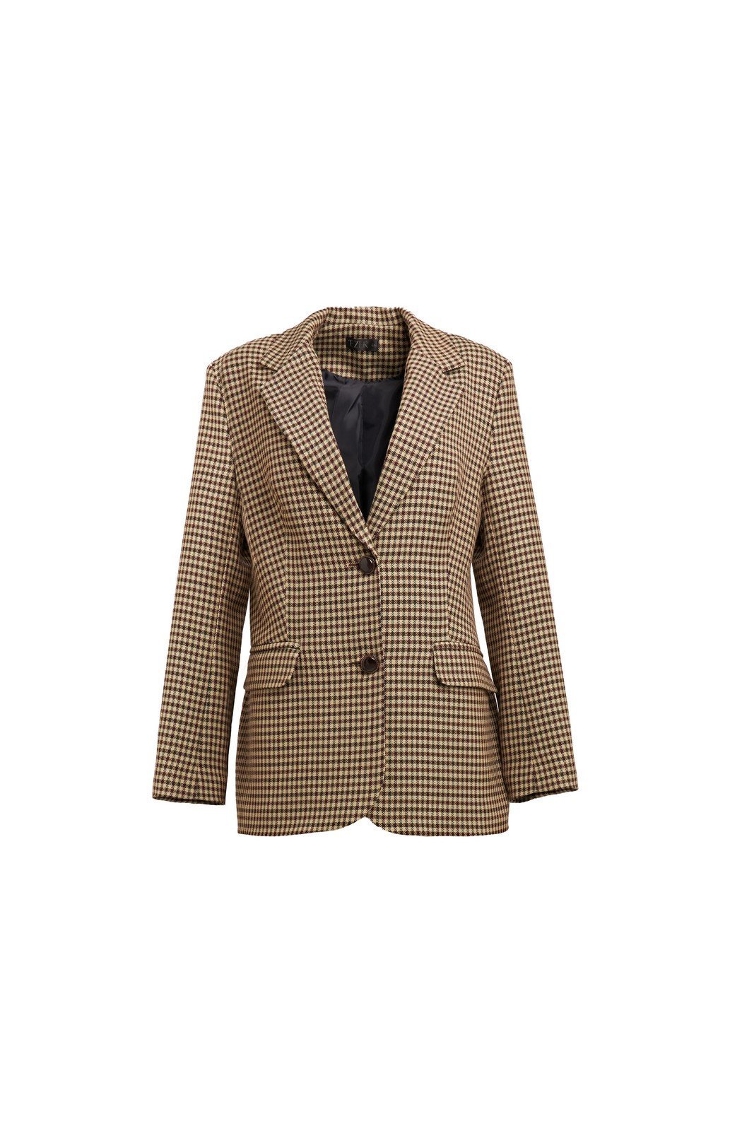 В этом сезоне осень-зима‘23 классическая клетка растеряла свою чопорность за счет сдержанного бежево-кориченевого принта: этим мотивом украсили однобортный приталенный жакет. Для создания модели мастера бренда ‘EZER использовали легкий материал на основе не мнущейся поливискозы, так же этот состав защищают от появления пиллей (катышек). Такая модель из осенне-зимней коллекции успешно справляется с многозадачностью, одинаково хорошо рифмуясь и с узкими брюками, и с юбкой. Богатые лаковые пуговицы придают особый английский стиль. подкладка:ПЭ 100%