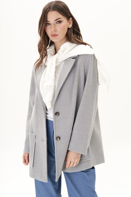 Комфортный, упрямлённый силуэт, втачной покрой, центральная застёжка и классический английский воротник. Фишка модели-крупные накладные карманы и широкая отделочная строчка.
