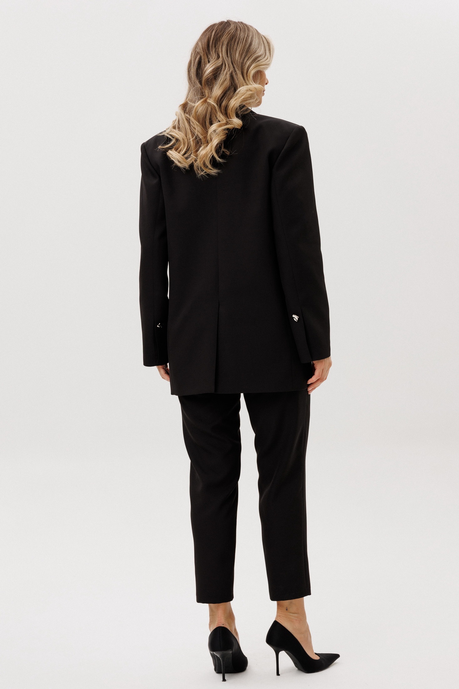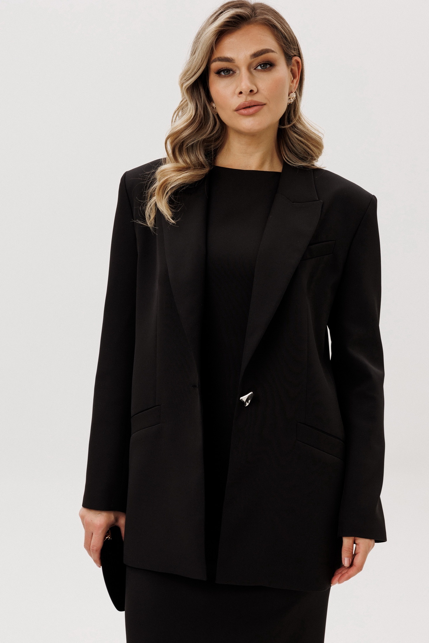 Элегантный женский жакет черного цвета выполнен из высококачественной ткани. Модель со строгим силуэтом оснащена центральной бортовой застежкой на пуговицы, что добавляет классический вид. Жакет имеет длинные рукава и нотки утончённости благодаря лаконичному дизайну без лишних деталей. Прорезные карманы в рамку без клапана на передней части удобны и практичны, подчеркивая функциональность модели. Эта универсальная и стильная вещь идеально подойдет как для офиса, так и для более официальных мероприятий.