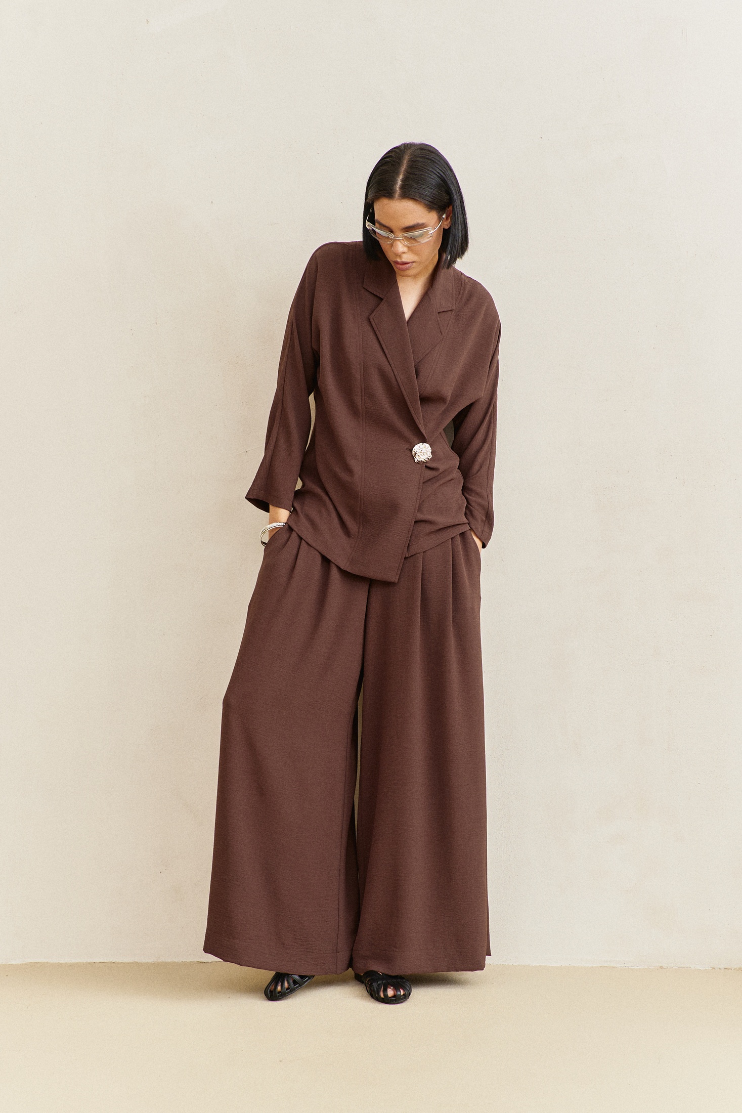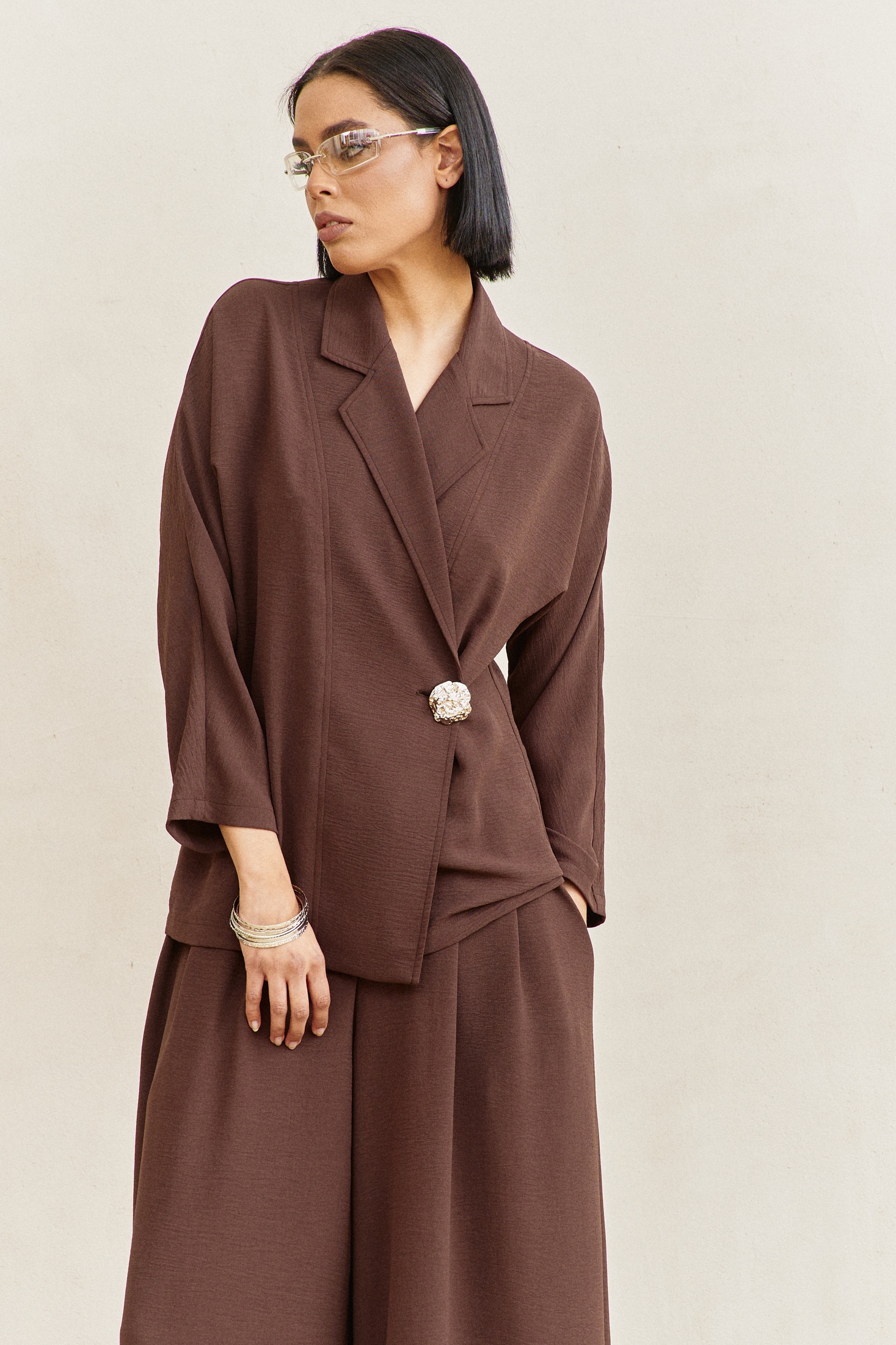 Жакет 2116 коричневый FLAIM предлагает стильный вариант для современного гардероба. Коллекция бренда FLAIM характеризуется сочетанием комфорта и классики. Этот жакет выполнен из мягкой костюмно-плательной ткани, содержащей вискозу, полиэстер и эластан для идеальной посадки и свободы движения. Полуприталенный силуэт и цельнокроеный рукав позволяют носить его как в офис, так и в повседневной жизни. Коричневый цвет и асимметричная застежка добавляют элегантности, а воротник пиджачного типа завершает общий образ. Подходит для весенне-осеннего сезона, обеспечивая комфорт и стиль в любое время года.