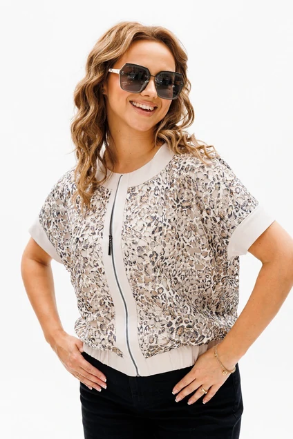 Бомбер прямого силуэта, по низу собран на резинку. Бомбер выполнен из кружевной ткани на подкладке и отделочной ткани по периметру. Застежка центральная на молнию. Рукав цельнокроеный коротнкий с манжетой по краю. Длина бомбера - 54 см, длина плеча - 32 см.