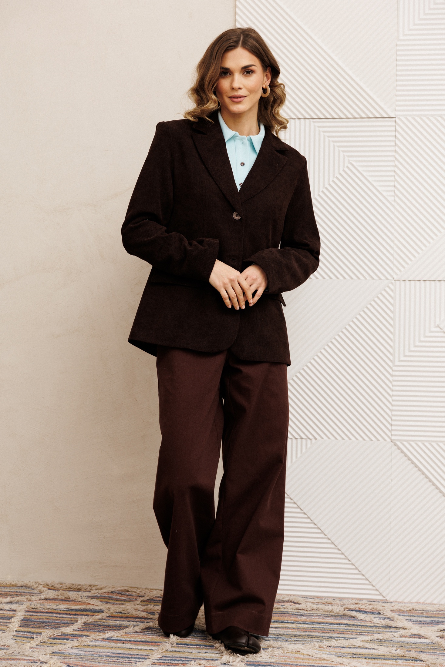 Жакет полуприлегающего силуэта из мягкой вельветовыой ткани. Застежка однобортная на две пуговицы, воротник пиджачного типа. Перед с талиевой вытачкой, рельефом и декоративным клапаном. Спинка с рельефами из проймы и средним швом. Рукав втачной двухшовный. Жакет на подкладке. Длина жакета - 68 см, длина рукава жакета - 60 см.