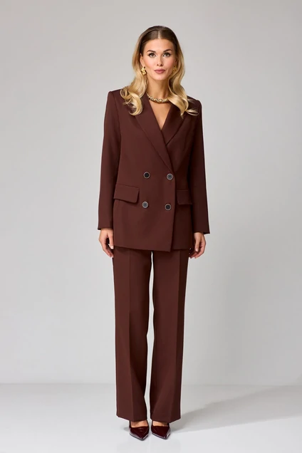 Жакет свободного силуэта, с двубортной с застежкой на четыре пуговицы. Перед с рельефом, с нагрудной вытачкой из горловины. По переду функциональные карманы с клапанами. Спинка со средним швом и рельефами. Рукав двухшовный втачной. Жакет на подкладке. Фурнитура может быть изменена с сохранением художественного образа. Длина жакета 72 см, рукава - 60 см, длина брюк по боковому шву с учетом пояса - 104 см.