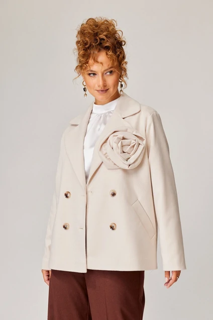 Жакет свободного прямого силуэта из плотной теплой трикотажной ткани с рисунком "ёлка". Перед с нагрудной вытачкой переведенной под лацкан. По переду прорезной карман с листочкой. Застежка двубортная на 4 пуговицы. Воротник пиджачного типа. Рукав одношовный втачной со слегка спущенным плечом. Жакет на подкладке. На правой части переда съемное украшение -цветок из основной ткани. Длина жакета - 64 см, длина рукава - 59 см.