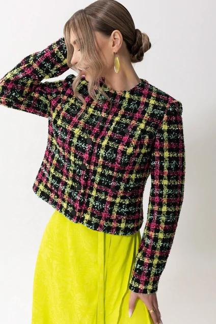 Жакет с центральной застежкой на петли и пуговицы, без воротника, с круглым вырезом горловины. По переду с накладными карманами на уровне груди и талии, закрепленными к полочкам петлей и пуговицей, рельефами, выходящими из проймы,. По спинке со средним швом. Рукав втачной, длинный. Комплектация: жакет на подкладке.