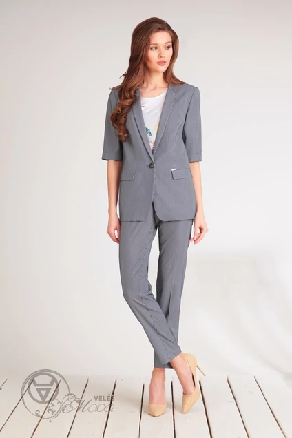 Описание внешнего вида: жакет без воротника, с цельнокроеными отложными лацканами. Перед с талиевыми вытачками, прорезными карманами с клапанами. Спинка со средним швом. Боковая часть переда переходящая на спинку. Силуэт: полуприлегающий Вид покроя рукава: втачной короткий с отложной манжетой Цветовая гамма для верха, подкладки, фурнитуры, отделки: жакет из эластичной ткани в одной цветовой гамме. Подкладка переда контрастна основной ткани. Тип ткани: текстильный, костюмно - платьевый Комплектация: жакет на подкладке по переду Длина изделия: 68см.
