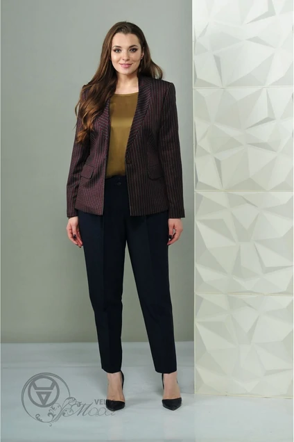 Оригинальный жакет с модными линиями кроя. со съемным бантом – завязкой Кокетка спинки переходит на полочку. центральной застежкой на петлю и пуговицу, с втачной стойкой по спинке, отрезным лацканом по переду. По переду с подрезом, прорезным карманом с клапаном и листочкой. Спинка со средним швом, рельефами, выходящими из проймы. Силуэт: полуприлегающий Вид покроя рукава: втачной, длинный Цветовая гамма для верха, подкладки, фурнитуры, отделки: жакет из эластичной ткани с геометрическим рисунком. Подкладка –. Тип ткани: текстильный, костюмно - платьевый Комплектация: жакет на подкладке из жакарда в тон основной ткани Длина изделия: 64 см, Длина рукава: 63 см