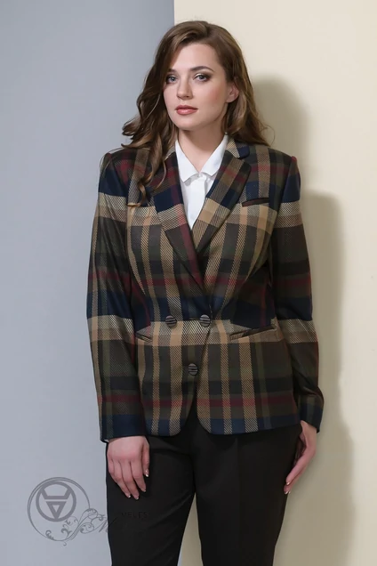 Жакет с центральной двубортной застежкой на петли и пуговицы, втачным воротником и лацканами пиджачного типа. По переду с талиевыми вытачками, прорезными карманами с листочками. Боковая часть переда переходит на спинку. Спинка со средним швом. Силуэт: полуприлегающий Вид покроя рукава: втачной, длинный, двухшовный. Цветовая гамма для верха, подкладки, фурнитуры, отделки: жакет из эластичной ткани с геометрическим рисунком. Подкладка – контрастна основной ткани. Тип ткани: текстильный, костюмно - платьевый Комплектация: жакет на подкладке