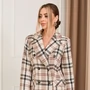Жакет с центральной двубортной застежкой на петли и пуговицы, без воротника.По переду с двумя рельефными швами, выходящими из проймы. На уровне линии талии расположены клапаны. Спинка со средним швом, рельефными швами, выходящими из проймы. Длина изделия: 52 см. Длина рукава: 62 см