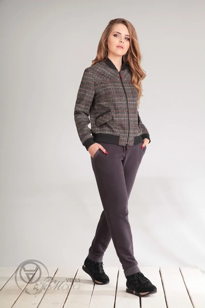 Жакет с центральной застежкой на тесьму-молнию, воротником-стойкой. Перед с отрезной кокеткой, нагрудными вытачками. Спинка с отрезной кокеткой, талиевыми вытачками. По переду с клапанами. Силуэт: полуприлегающий Вид покроя рукава: втачной, длинный, с отрезной манжетой. Цветовая гамма для верха, подкладки, фурнитуры, отделки: жакет из неэластичной ткани с геометрическим рисунком. Стойка, планка клапанов, манжеты из трикотажного полотна в тон основной ткани. Подкладка с рисунком в тон основной ткани. Стойка и клапаны декорированы тесьмой. Тип ткани: текстильный, костюмно - платьевый