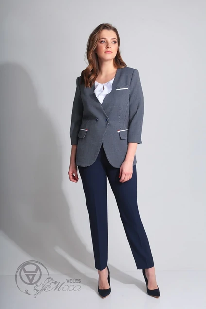Жакет с центральной двубортной застежкой на петли и пуговицы. По переду с рельефами, выходящими из проймы, на уровне линии талии расположен прорезной карман в рамку с клапаном. По левой полочке на уровне линии груди расположен прорезной карман с листочкой. Спинка со средним швом, рельефами, выходящими из проймы. Силуэт: полуприлегающий Вид покроя рукава: втачной, 7/8, с отлетной шлицей в локтевом шве. Цветовая гамма для верха, подкладки, фурнитуры, отделки: жакет из эластичной ткани с рисунком. Рамки карманов и отделка листочки из однотонной ткани контрастной основной ткани. Тип ткани: текстильный, костюмно - платьевый Комплектация: жакет на подкладке Длина изделия: 63-66см (соотв. размеру) Длина рукава: 48-48,5 см (соотв. размеру)
