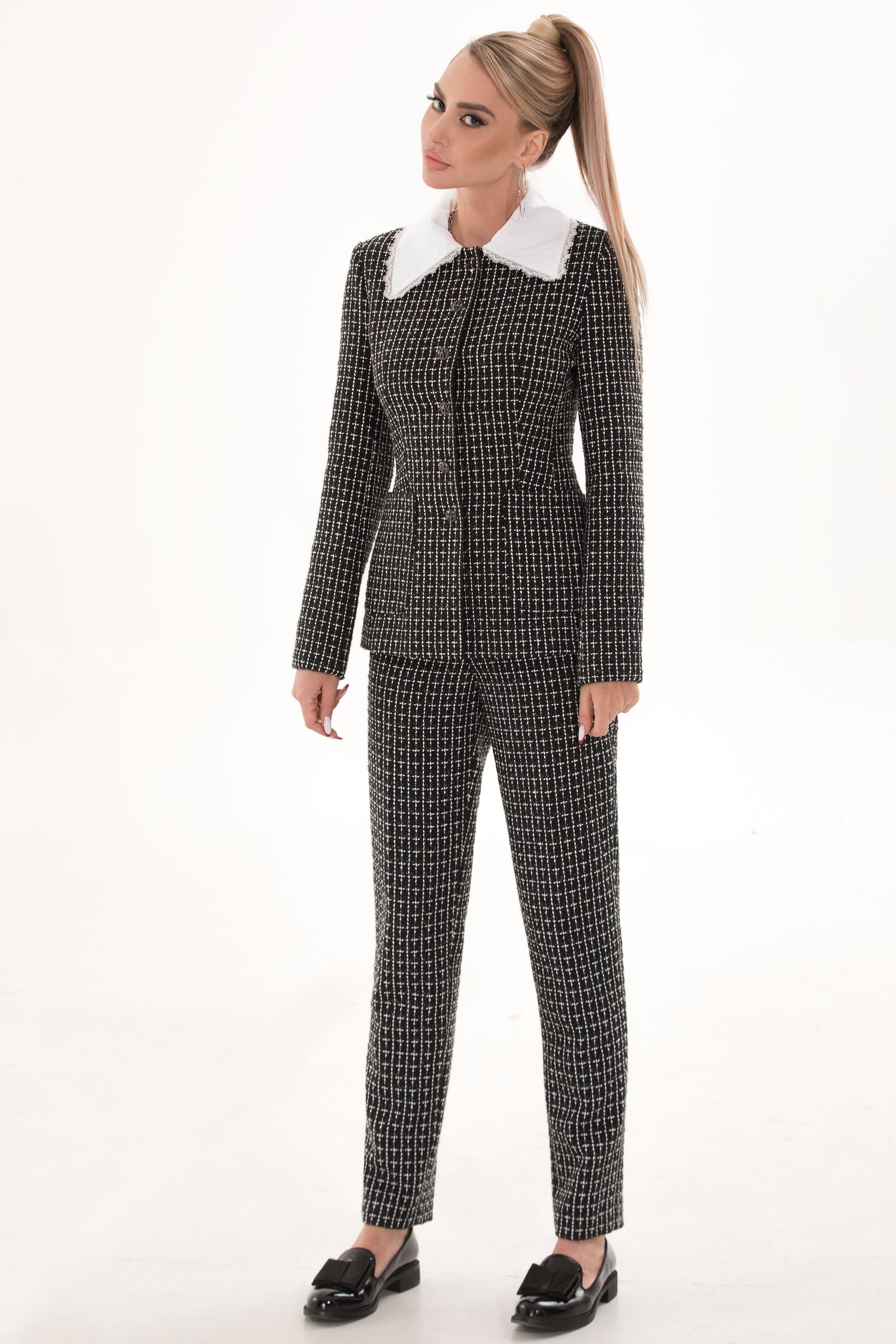 Жакет с центральной застежкой на петли и пуговицы, круглым вырезом горловины. По переду с накладными карманами. Перед с рельефами, выходящими из проймы. Спинка со средним швом, рельефами, выходящими из проймы. Жакет со съемным воротником