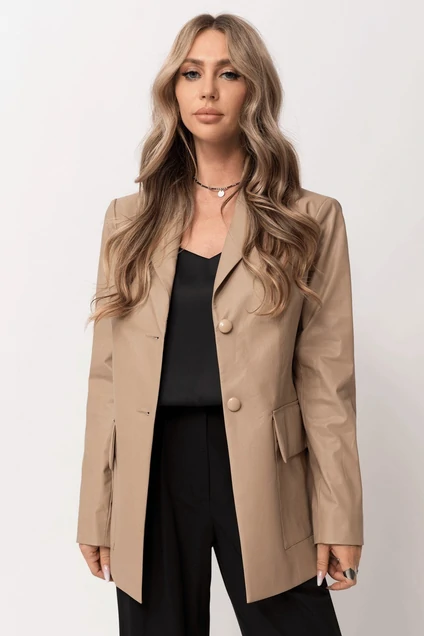 Жакет с центральной застежкой на петли и пуговицы, втачным воротником и отложными лацканами пиджачного типа. По переду с талиевыми вытачками и рельефами, выходящими из проймы. На уровне линии бедер расположены накладные карманы с клапанами. Спинка со средним швом, рельефами, выходящими из проймы. Рукав втачной, длинный. Жакет со съемным поясом. Комплектация: жакет на подкладке