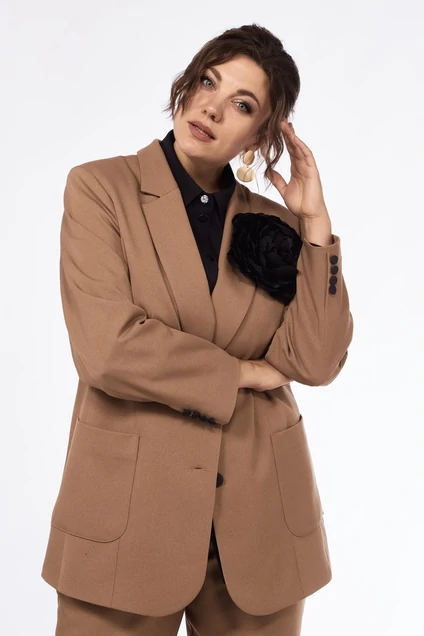 Жакет женский прямого слегка приталенного силуэта, слегка приталенный, с центральной однобортной застежкой и воротником пиджачного типа. По переду рельефы и накладные карманы. Спинка со средним швом и рельефами. Рукава втачные, двухшовные с имитацией «шлицы». Изделие на комфортной подкладке. Легко комбинируется в гардеробе, идеально сидит на фигуре. Украшение «цветок» не входит в комплектацию. Длина рукава – 60,5см Длина изделия – 73см