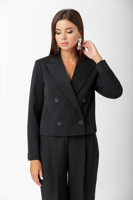 Укороченный двубортный жакет прямого силуэта. Отложной воротник с лацканами. Рукава с имитацией шлицы и застежки на пуговицы. Спинка со средним швом.