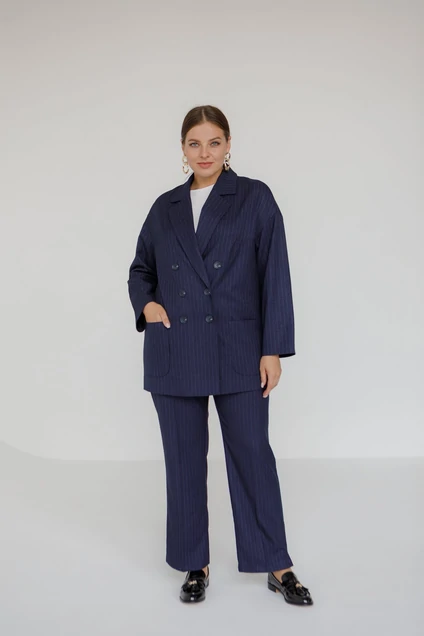Изумительный двубортный женские жакет плюс сайз в тонкую полоску в синем оттенке. Идеальная посадка по фигуре, выгодно сочетается с брюками, юбками или джинсами - на ваше усмотрение и ваш вкус в повседневных образах. Поливискозная подкладка. К такому жакету можно подобрать брюки 2032 в тон либо сочетать с любыми подходящими элементами из вашего гардероба.