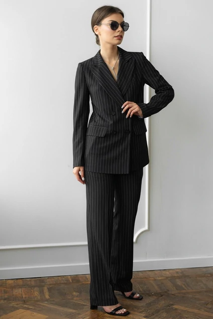 Этот темного цвета женский жакет в тонкую светлую полоску — идеальный выбор для стильной и уверенной женщины. Элегантный дизайн с лацканами спереди и двумя прорезными карманами добавляет изысканности и функциональности. Создавайте неповторимые образы, сочетая этот жакет с любимыми предметами гардероба.