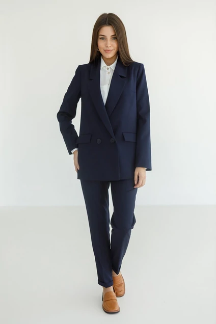 Свободный двубортный жакет на подкладке классического кроя на четырех пуговицах. Рукав со спущенной линией плеча. Два больших накладных кармана . В сочетании с брюками арт. 738 составляют стильный костюм.