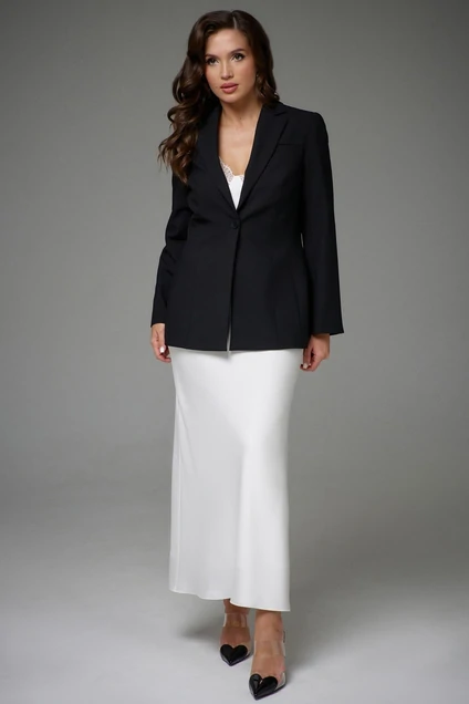 Жакет полуприлегающего силуэта на подкладке. Перед с декоративными вытачками и отрезными бочками. На левой стороне переда функциональный нагрудный карман с листочкой. Спинка со средним швом и талиевыми вытачками. Воротник пиджачного типа. Застежка центральная бортовая застегивающаяся на 1 декоративную пуговицу. Рукав длинный втачной с потайной молнией в шве. Молния в рукаве придает жакету индивидуальность.