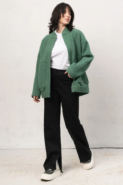 Прямого силуэта со спущенной линией плеча,  центральной застежкой на 7 потайных кнопок.Воротнтк стойка с необработанным краем.Перед с накладными карманами и необработанным краем и наклонным входом.По низу пояс с резинкой внутри.Изделие без подкладки,все внутренние швы окантованы.