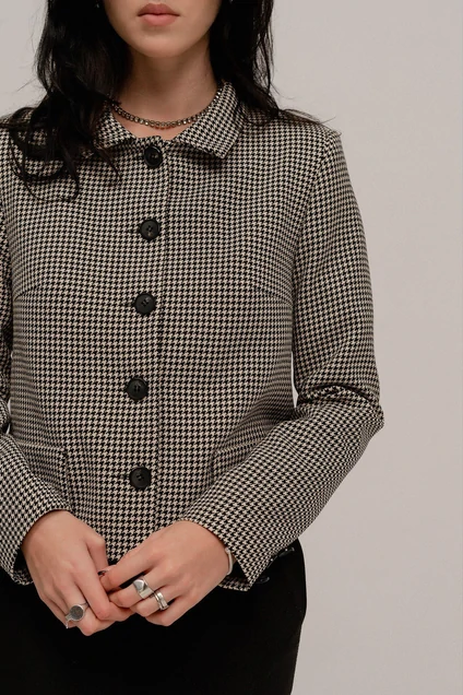 Жакет женский укороченный на подкладке с центральной застежкой.Прямой силуэт ,втачной рукав,воротник по горловине.Декорирован клапанами по линии талии.
