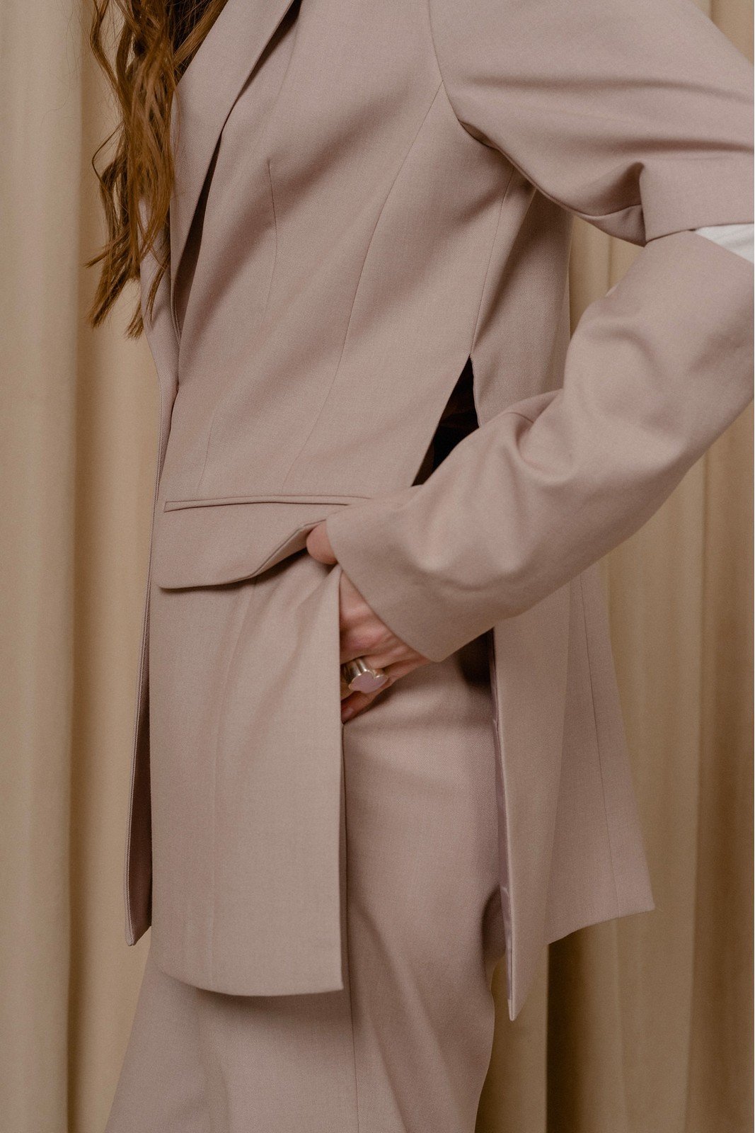 Жакет женский прямого силуэта из ткани однотон,с центральной застежкой по переду на 2 петли и пуговицы,с рукавом втачным до запястья , с воротником пиджачного типа с небольшими лацканами. Частично на подкладке.Перед с карманами клапанами,в боковых швах высокие разрезы.Рукав с горизонтальным разрезом по верхней части в области локтя.