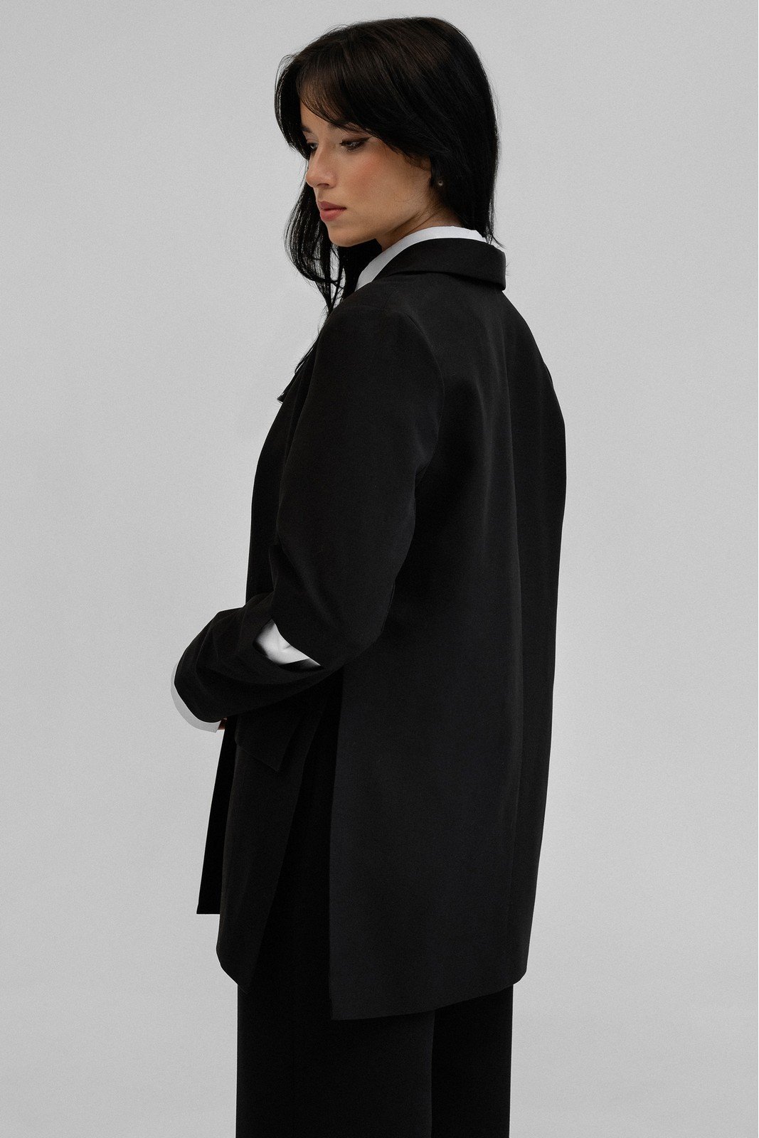Жакет женский прямого силуэта из ткани однотон,с центральной застежкой по переду на 2 петли и пуговицы,с рукавом втачным до запястья , с воротником пиджачного типа с небольшими лацканами. Частично на подкладке.Перед с карманами клапанами,в боковых швах высокие разрезы.Рукав с горизонтальным разрезом по верхней части в области локтя.
