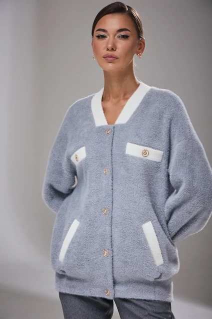 Жакет женский прямого силуэта, на подкладке, со спущенной линией плеча. Горловина V-образной формы, обработана тканью-компаньоном контрастного цвета. Рукав длинный одношовный со складками, обработан притачной манжетой из основной ткани. Перед с центральной застежкой на кнопки, с нагрудными (нефункцион.) и боковыми (функцион.) карманами с листочкой из ткани-компаньона контрастного цвета. Низ жакета сужен при помощи застрочных складок. Декоративные элементы и фурнитура могут отличаться от заявленных на фото. Длина изделия по спинке 73 см. Длина рукава от горловины 73,5 см.