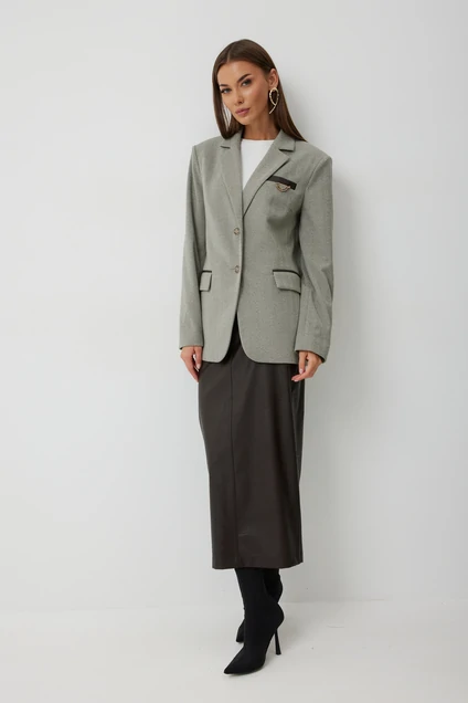 Жакет женский однобортный на подкладке прямого силуэта из трикотажной ткани. На передних частях жакета отрезной бочок с нагрудными вытачками. Обработаны прорезные карманы «в рамку» с клапаном. На левой части переда обработан карман с листочкой и декоративной пришивной деталью. Листочка, рамки кармана и нижний воротник выполнены из искусственной кожи. Спинка со шлицей в среднем шве. Рукав втачной двухшовный. Горловина обработана втачным воротником с отложными лацканами. Низ передних частей имеет закругленную форму. Жакет застегивается н а 2 декоративный пуговицы.