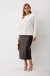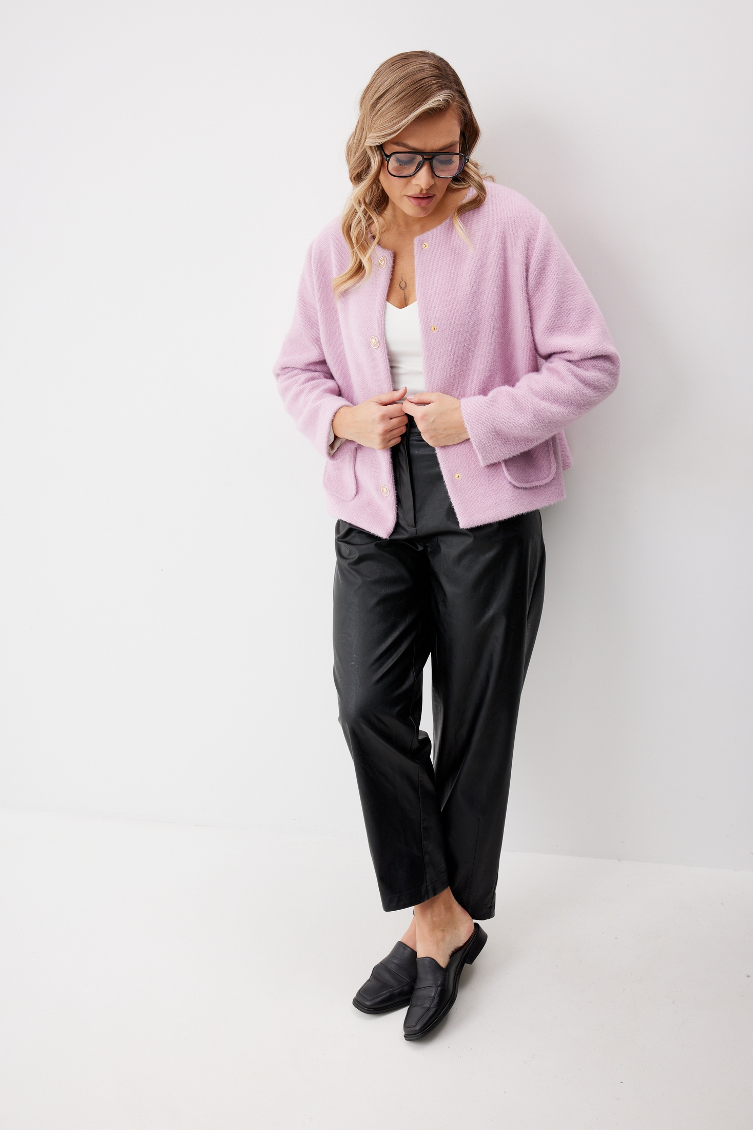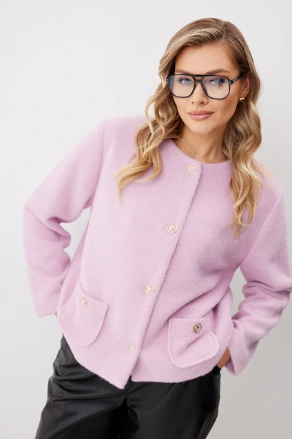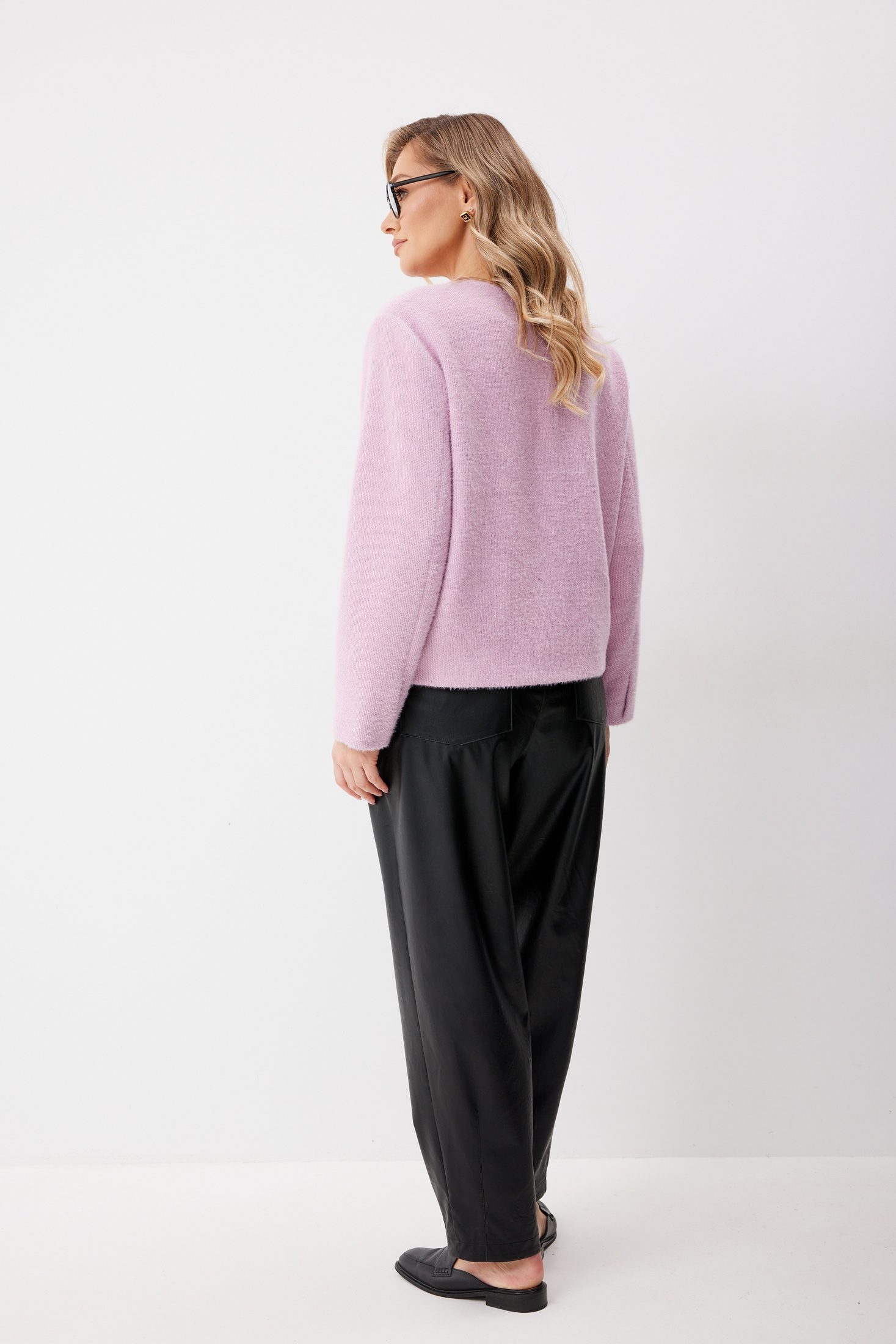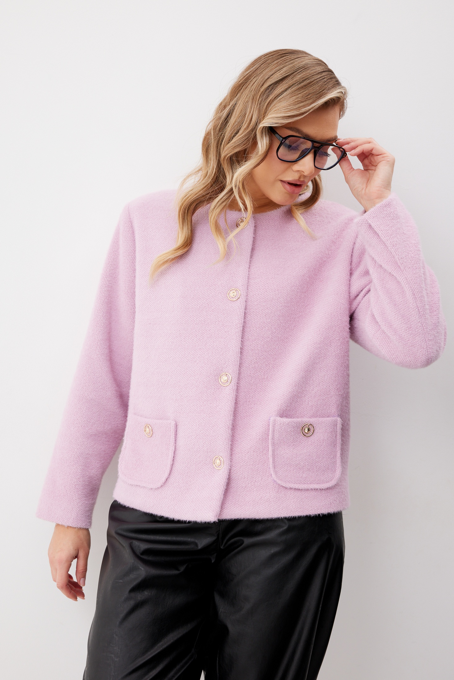 Жакет женский из трикотажной ткани прямого силуэта на подкладке. На деталях переда настрочены накладные карманы округлой формы застегивающиеся на декоративные кнопки. Спинка прямая. Рукав двухшовный с имитацией шлицы. Горловина округлой формы. Жакет застегивается на декоративные кнопки. Длина изделия по спинке 57 см, длина рукава 62,5 см.