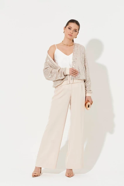 Жакет женский из нарядной ткани в пайетки. Жакет с длинным втачным рукавом. По низу рукава манжета на резинке. По переду имеются прорезные карманы в рамку. Горловина обработана стойкой. Застежка на молнию, вдоль которой отделочные планки. По низу жакета притачной пояс с резинкой. Планки вдоль молнии, манжеты, пояс по низу изделия оформлены деталями из атласной ткани. Жакет на вискозной подкладке. В этом нарядном жакете вы будете неотразимы!