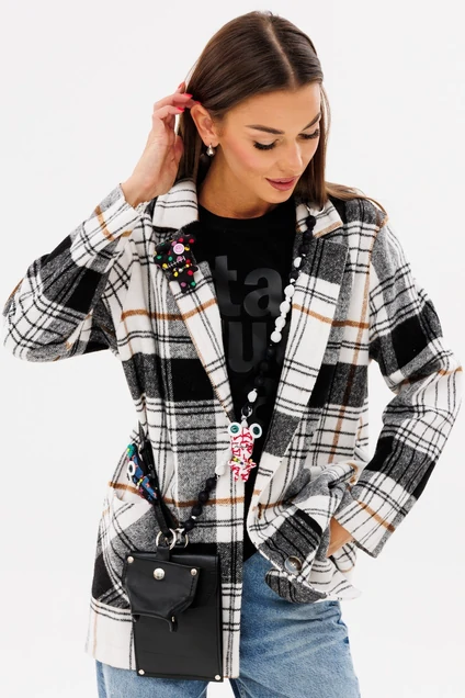 Представляем вам элегантный жакет из фланели, который станет незаменимой частью вашего гардероба. Этот жакет с отложным воротником и накладными карманами сочетает в себе классический стиль и современную функциональность.