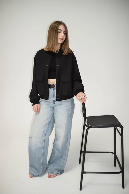 Бомбер свободного силуэта из хлопковой ткани, на подкладке, с втачными одношовными рукавами. Воротник, манжеты и отделка низа изделия выполнены из эластичной хлопкокой ткани (кашкорсе). По низу переда настрочены накладные карманы с клапаном. Застёжка по борту на 5 кнопок.