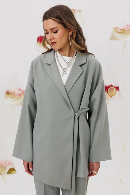 Жакет - кимоно, на подкладке. По переду застежка на завязывающиеся в бант ленты. Идеальныйц жакет для создания мягкого образа. если вам нужно быть в офисс коре, но вы не хотите носить строгие линии, то этот жакет точно для вас.
