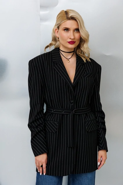 Удлиненный жакет в полоску. По переду расположены карманы с клапаном. Застежка центральная. Рукав втачной со сборкой на уровне локтя. В комплекте идет пояс с регулировкой нужного вам приталивания. Жакет можно носить, как с брюками и джинсами, так и самостоятельно с плотными леггинсами и высокими сапогами. Самый желанный жакет этого сезона.
