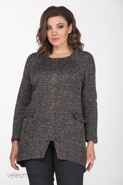 Жакет полуприлегающего силуэта, удлиненный, с круглым вырезом горловины. Перед с нагрудными вытачками, центральной застежкой на металлическую тесьму - "молния". Чуть выше уровня бедер прорезные карманы, вход в которые обработан листочками. Над листочками -клапаны. Низ жакета с притачной, фигурной деталью в виде широкого манжета. Рукав длинный, покроя "реглан". Спинка с фигурной кокеткой. Жакет без подкладки. Размеры 48-52: Длина изделия 84 см, длина рукава изделия 60 см. Размеры 54-58: Длина изделия 87 см, длина рукава изделия 61 см.