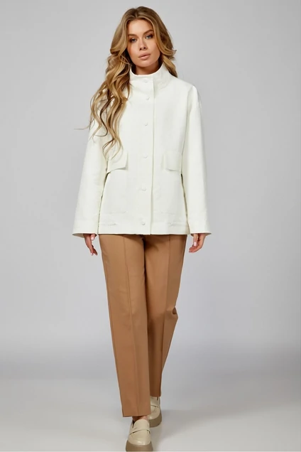 Жакет женский свободного силуэта, на подкладке, длиной ниже линии бедер, со спущенной линией плеча, с втачными рукавами, с втачной стойкой, с центральной застёжкой на 5 кнопок и 1 кнопку на стойке, понизу отстрочен «тоннель» для протяжки резинки с фиксатором. Детали переда с притачными планками, с накладными карманами, с клапанами. Рукава втачные двухшовные, с передним и локтевым швами.