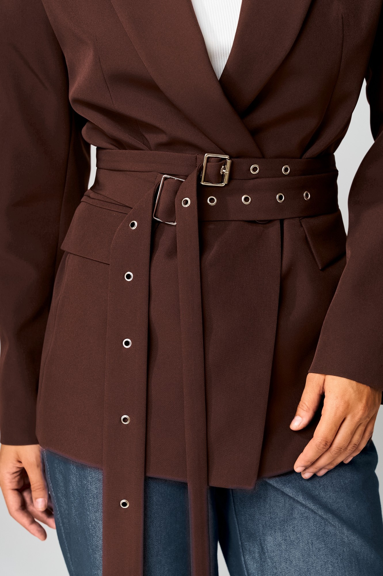 Жакет выполнен из костюмной ткани. Декор может отличаться от представленного на фотографии. 2 съемных пояса из основной ткани в комплекте.