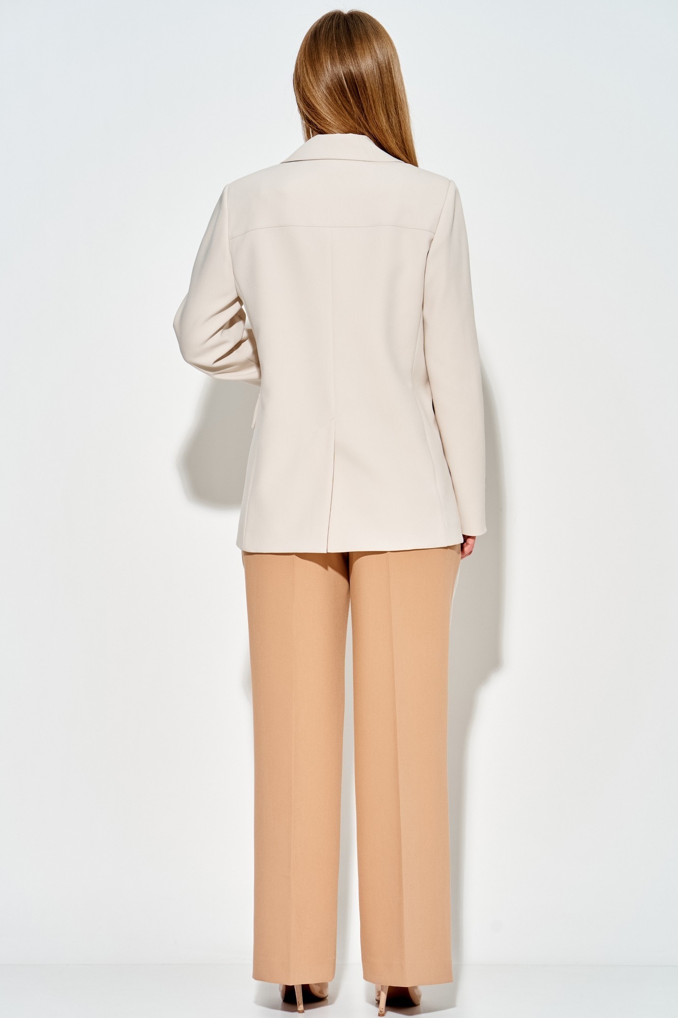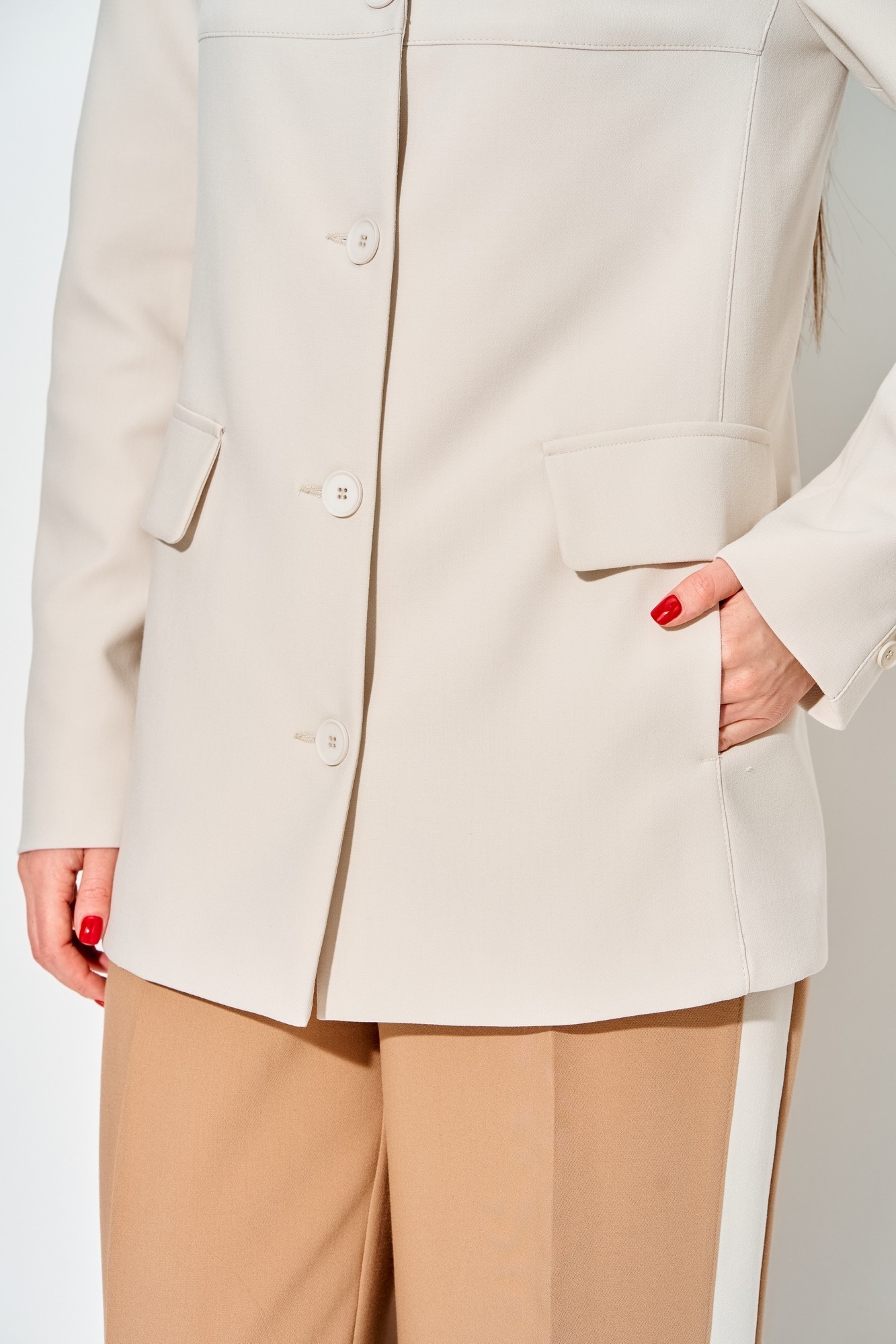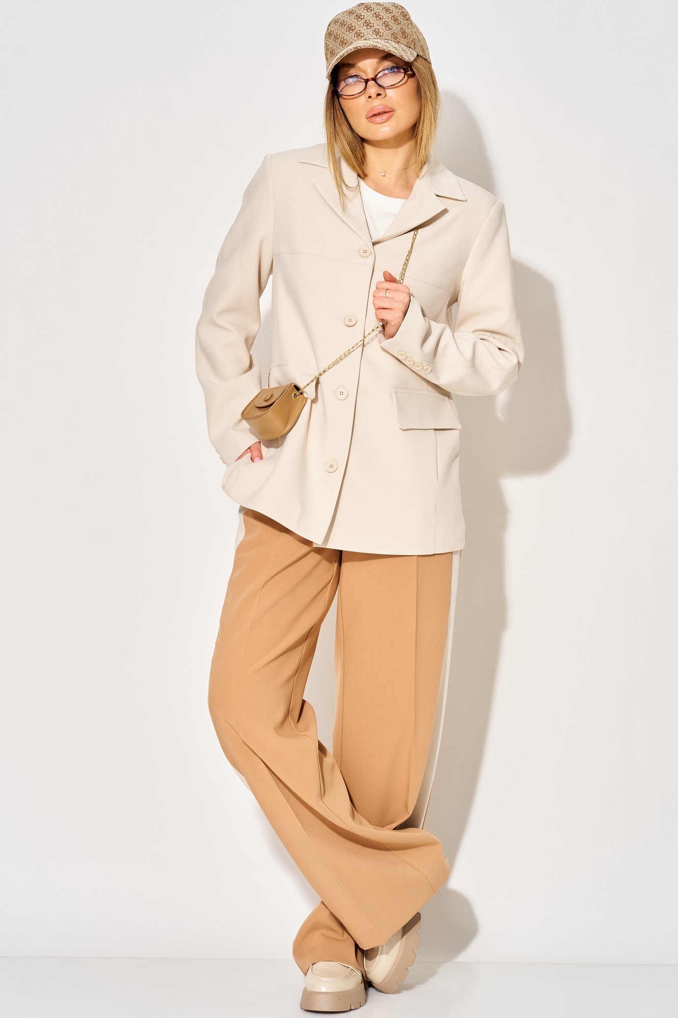 Жакет 814 слоновая кость LAIKONY — выбор для тех, кто ценит стиль и комфорт. Коллекция бренда LAIKONY предлагает однобортный жакет из костюмной ткани, в составе которой полиэстер, вискоза и спандекс. Этот жакет свободного силуэта имеет длину ниже линии бедер и выполнен с застежкой на пуговицы. Особенности дизайна включают отложной воротник, кокетки на спине и передней части, а также декоративные клапаны на талии. Жакет имеет втачные одношовные рукава длиной 62 см и центральный подрез. Задняя часть украшена средним швом и шлицей. Удобный и стильный, он подойдет для офиса и деловых встреч в любое время года. Изделие доступно в цвете слоновая кость, что добавляет универсальности вашему гардеробу. Длина по спинке варьируется от 70,5 до 72,5 см в зависимости от размера.