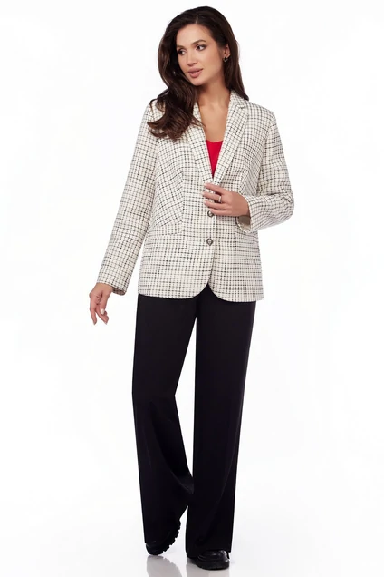Жакет полуприлегающего силуэта средней длины выполнен из ткани «Шанель» с жаккардовым переплетением. Отложной воротник и лацканы, застежка на две пуговицы. Отрезной бочок и вытачки впереди, края полочек внизу с закруглением. Внутренние карманы с листочками. По спинке шов. Рукав длинный. Жакет на подкладке.