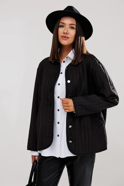 Жакет на подкладке из актуального стеганого полотна, прямого свободного силуэта с прибавками умеренного направления oversize. Линия плеча чуть спущена. Рукав втачной, двухшовный. Длина рукава 60-62 см.