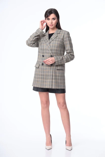 Жакет полуприлегающего силуэта с двубортной застежкой на петли и пуговицы. Воротник пиджачного типа с отложными лацканами. Перед с отрезными бочками и нагрудными выточками, прорезными карманами с клапаном. Спинка с талиевыми вытачками и средним швом, в которых обработана шлица. Рукав втачной двухшовный длинный. Жакет на подкладк