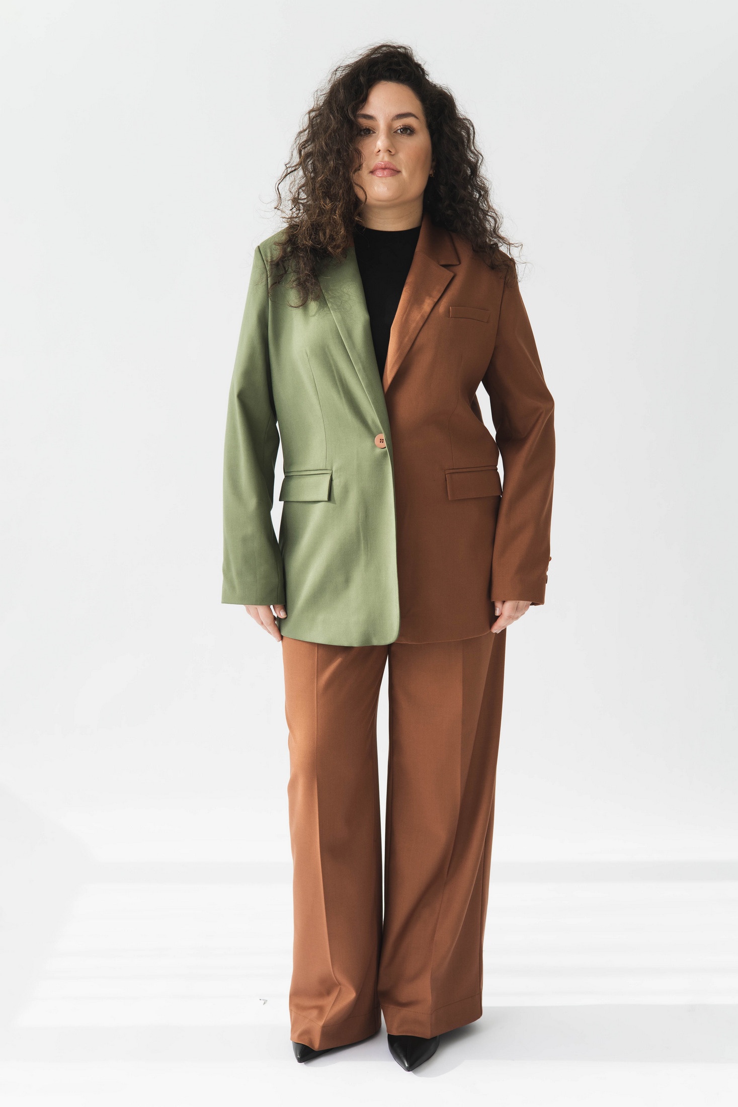 Модель идет в трех универсальных размерах: 44-46, 48-50, 52-54. Жакет прямого свободного кроя выполнен из лащенной текстильной поливискозы высокого качества. Однобортный жакет имеет английский воротник, прорезные карманы с патами, шлицу по спинке. Жакет на подкладке. Подкладка жаккардовая в тон основной ткани. Женский жакет стеговается на 1 пуговицу. Пуговицы маловые в тон закета, на левом рукаве 1 металлическая пуговица с эпоксидной смолой в виде сердечка, которая является декоративным элементом. Жакет выполнен как в классическом однотонном вариенте, так и в трендовом направлении колорблок, где два красивый оттенка дополняют друг друга и дают настоящий полет фантазии в вариативности сочетиний и комбинаций образов. Длина изделия по спинке - 72 см, длина рукава - 60 см. Собрать костюм можно с брюками артикулы: Р-025 или Р-026