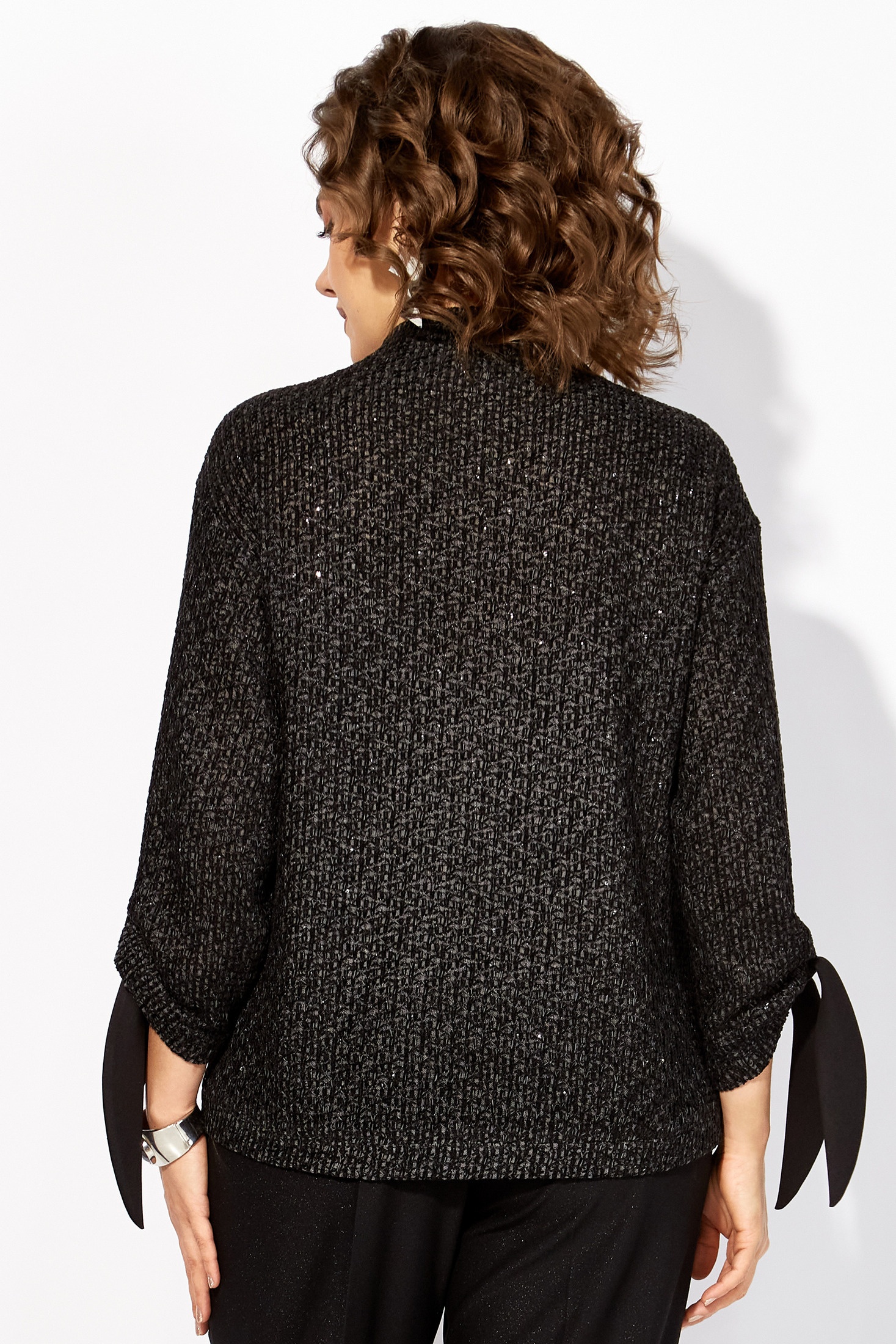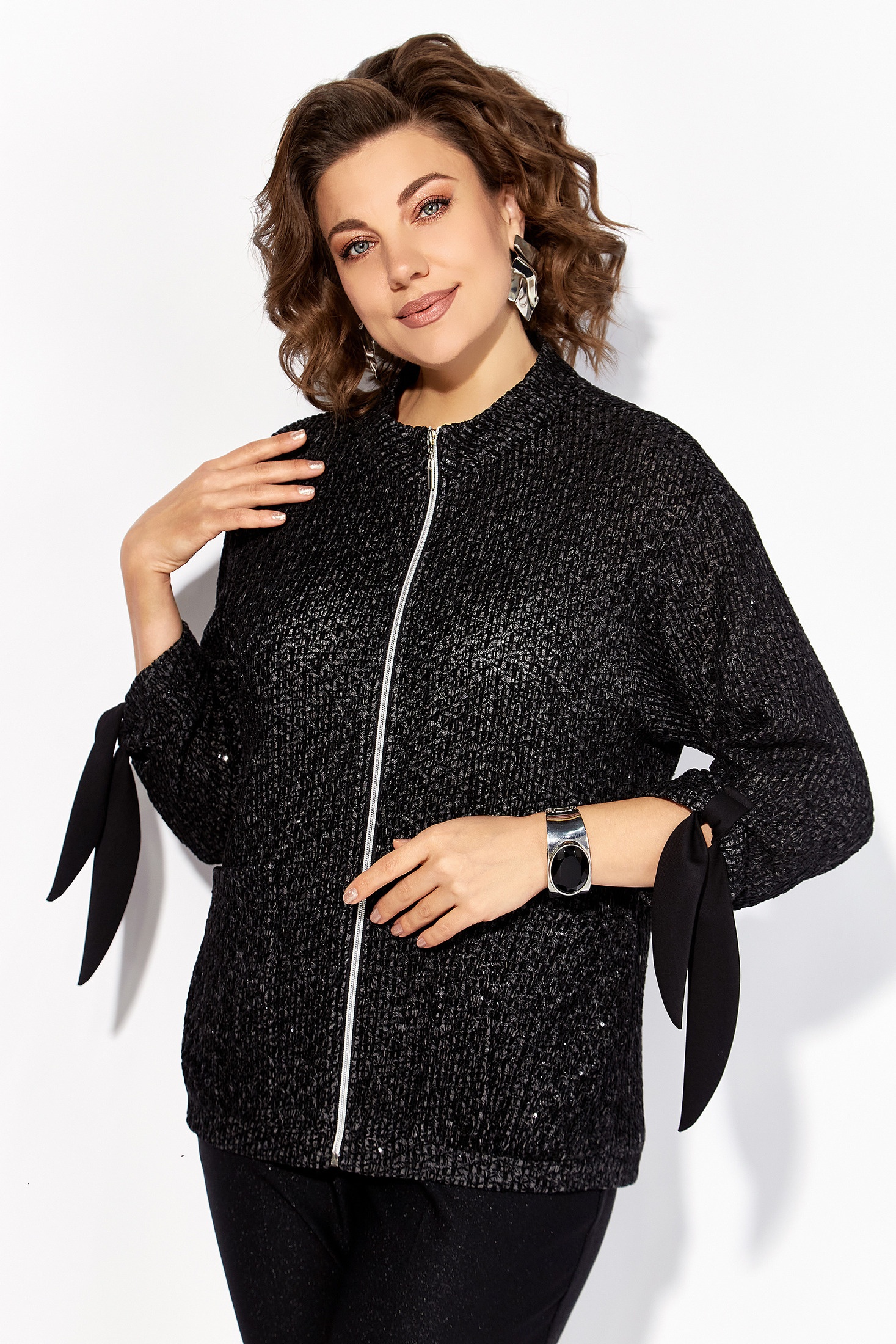 Эффектный, нарядный облегченный жакет, выполнен из вязанного трикотажа с эффектом легкого мерцания. Модель свободного силуэта, с рукавом длиной ¾-ти на спущенном плечевом поясе. Горловина обработана полулежащей стойкой. Застежка центральная на молнию. По полочке расположены аккуратные накладные карманы. Низ изделия оформлен притачной планкой. Изюминкой данной моделям служит необычные паты по рукаву с завязкой в виде банта.