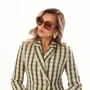 Жакет двубортный умеренного объёма из тёплой мягкой ткани. Застёжка на две пуговицы. По бокам расположены функциональные прорезные карманы с клапаном. Жакет на подкладке. Длина жакета по спинке 70-71 см.