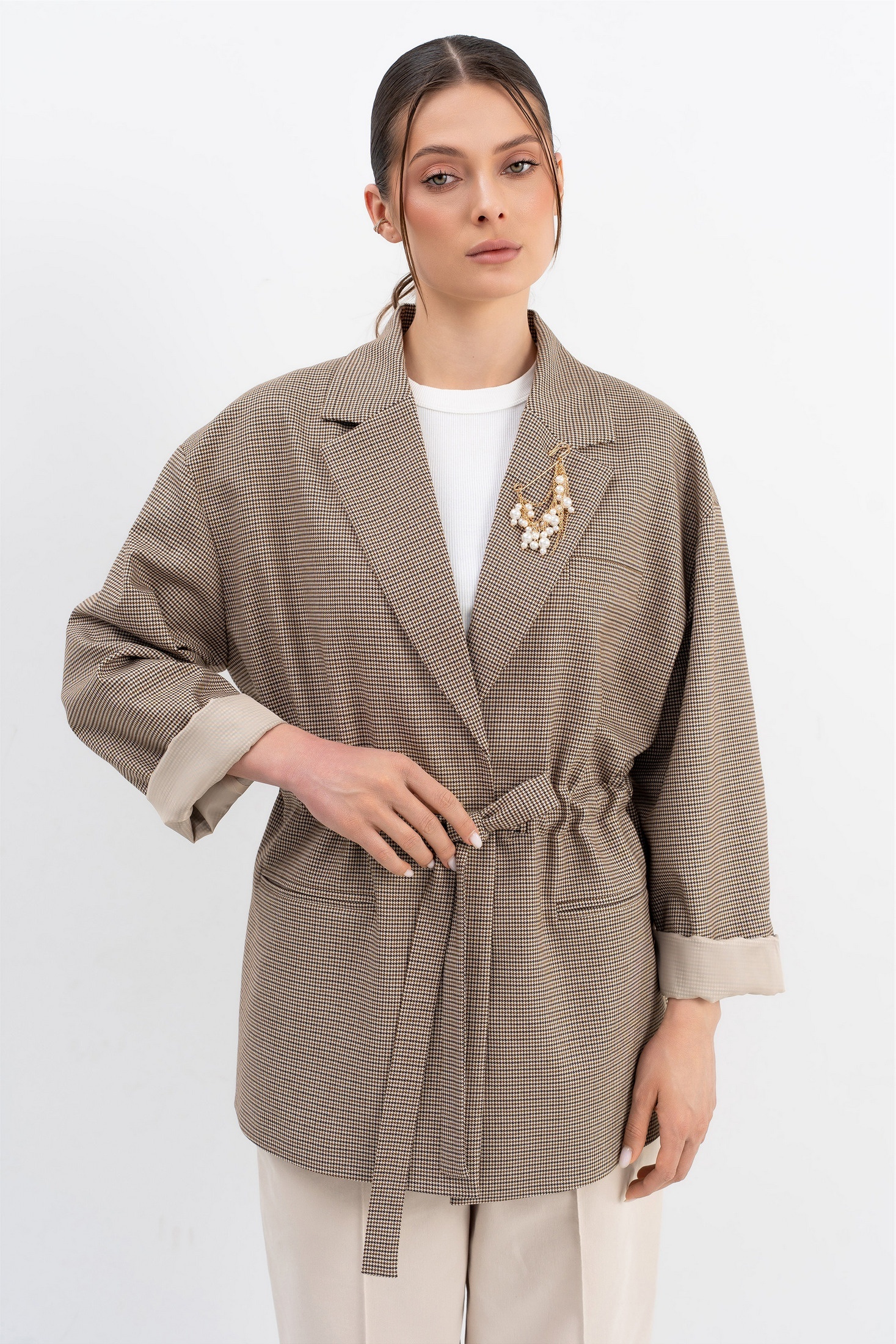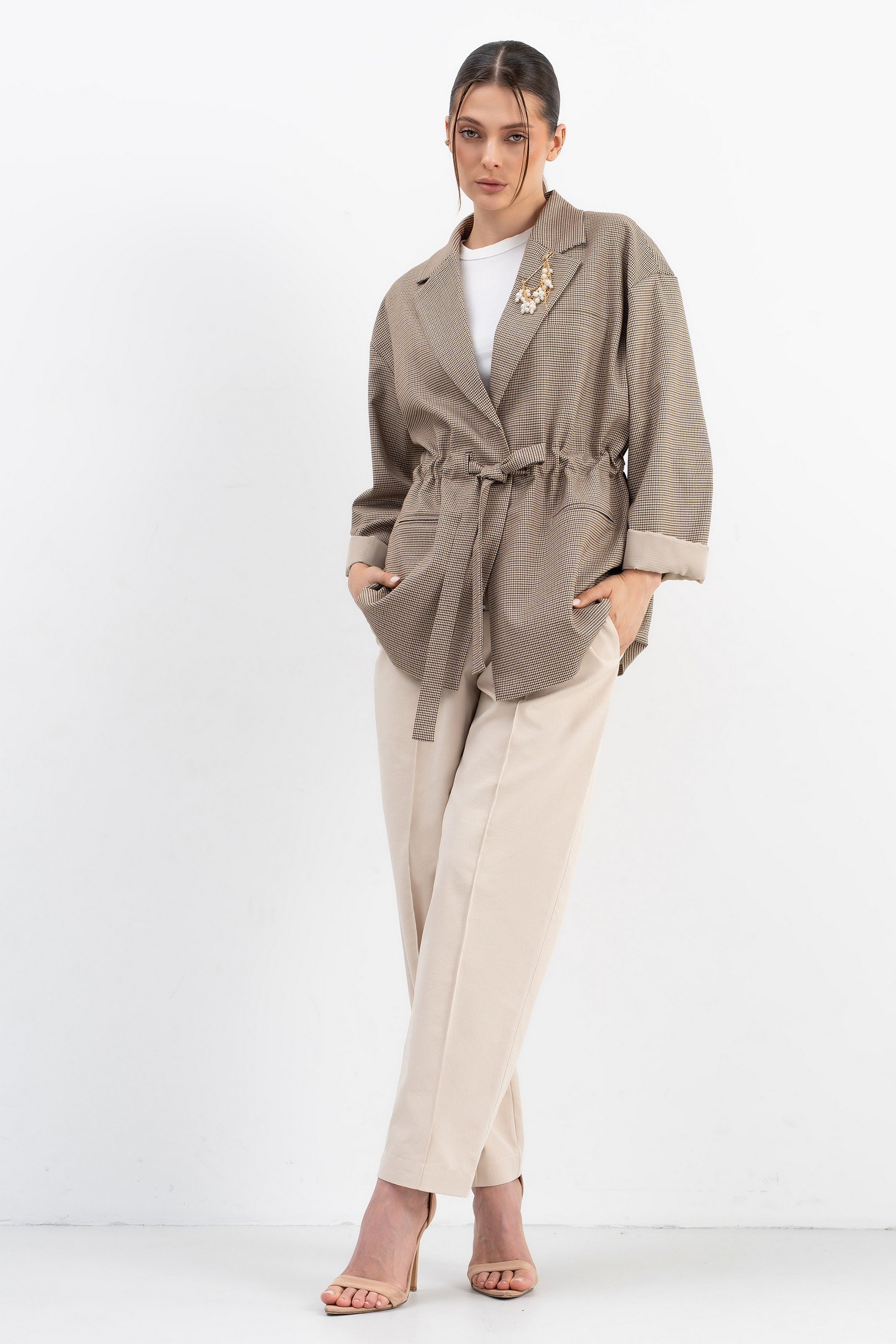 Жакет 274 бежевый LUNA сочетает в себе современные тренды и комфорт. Коллекция бренда LUNA предлагает жакет из костюмной ткани, комбинирующей полиэстер и вискозу, что обеспечивает мягкость и легкость. Свободный крой прямого силуэта и спущенная линия плеча обеспечивают свободу движений, а застёжка на кулису и пояс позволяют варьировать посадку. Декоративная брошь на лацкане добавляет стильный акцент. Карманы в рамку делают этот жакет практичным для офисных будней и вечерних прогулок. Универсальный бежевый цвет легко сочетается с разнообразными образами, а жакет подходит для носки весной и осенью.