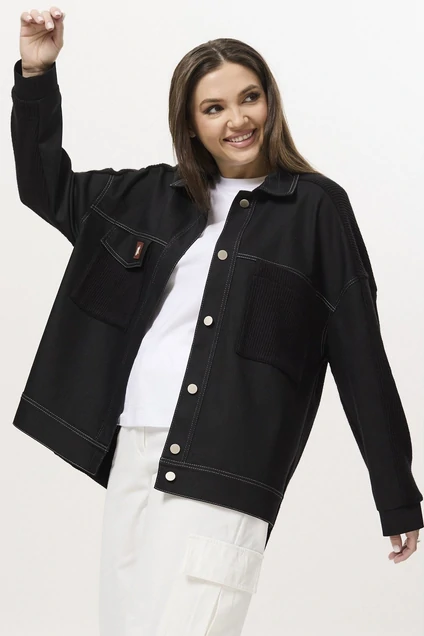 Полочка из джинсовой ткани, застежка на петли и пуговицы, выполнена на притачной планке. Воротник рубашечного типа. Полочка с кокеткой, ниже которой выполнены накладные карманы из трикотажной ткани. Снизу полочки идет притачная манжета. Рукав и цельная спинка из трикотажа крупной вязки. Рукав втачной, двухшовный, по низу рукава притачная манжета, линия плеча спущена. В жакете спинка немного длиннее полочки.