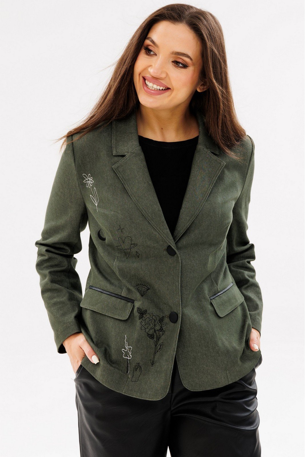 Жакет полуприлегаюшего силуэта. Воротник пиджачного типа, застежка центральная однобортная на две петли и пуговицы. Полочка с талиевыми вытачками и функциональными карманами "в рамку" с клапаном. На полочке расположена дизайнерская вышивка. Спинка с рельефами. Рукав втачной двухшовный. Низ борта закругленной формы. Жакет без подкладки.