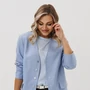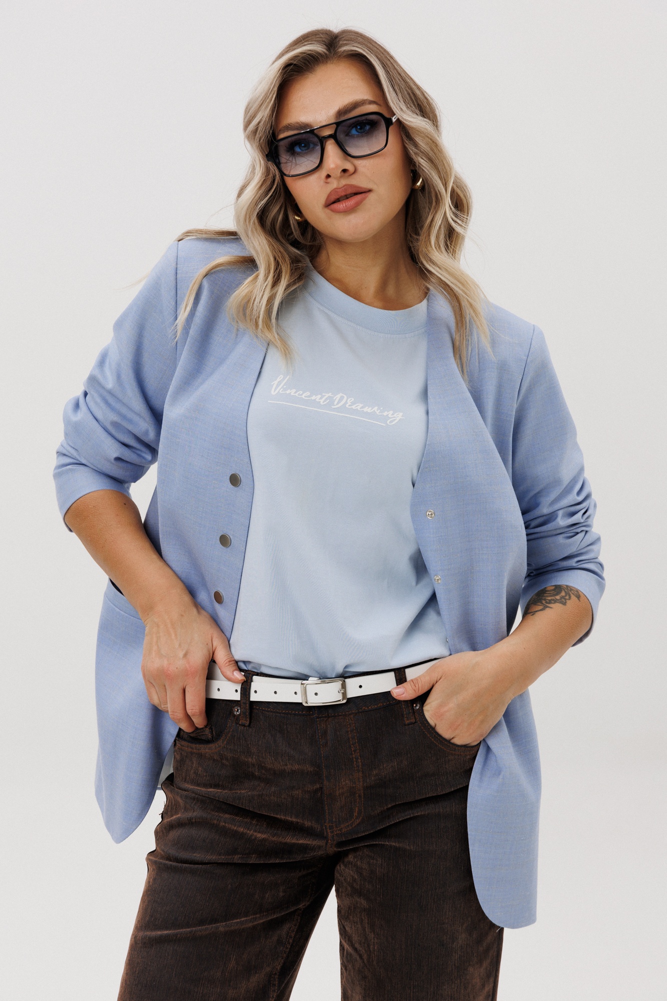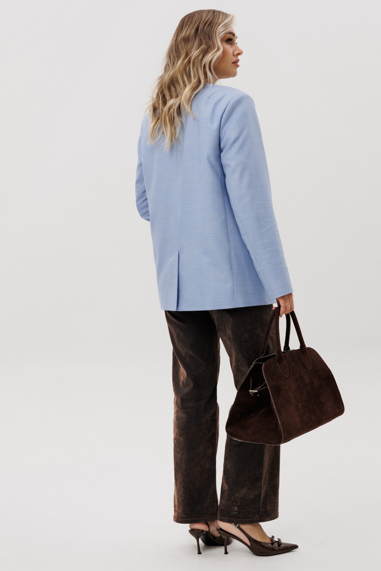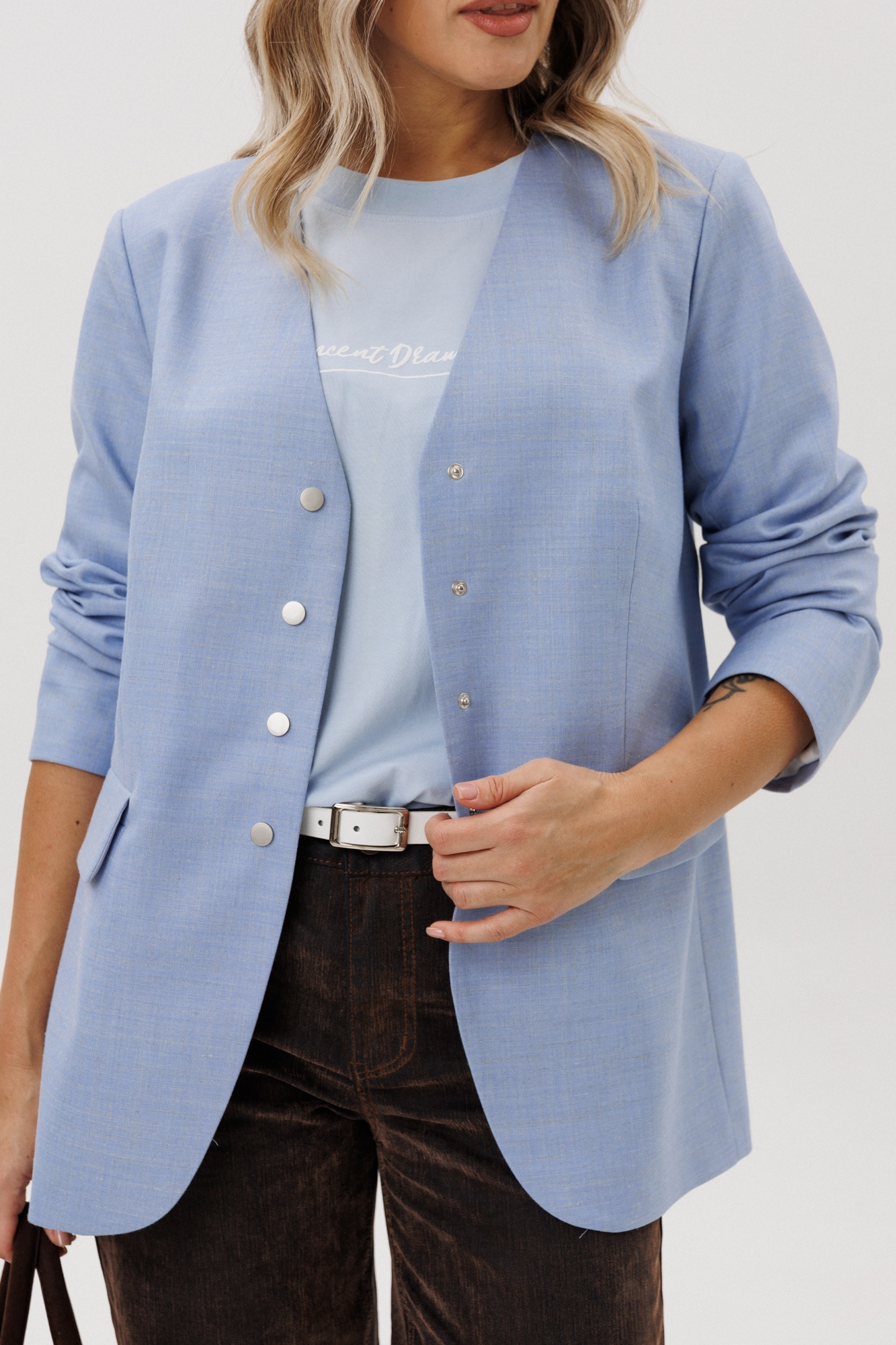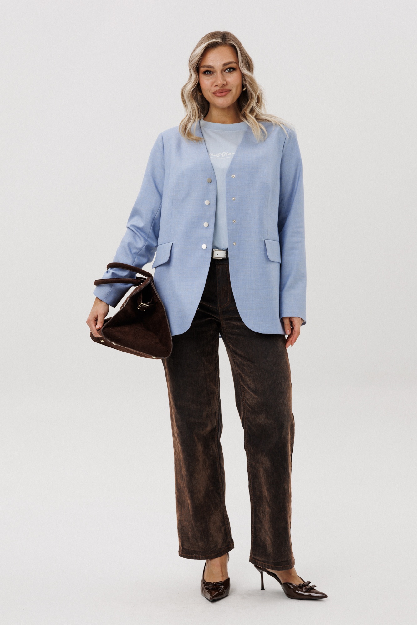Стильный жакет светло-голубого цвета выполнен из качественной полушерстяной ткани прямого силуэта. Элегантная модель без воротника и с втачными рукавами подчеркивает изысканность образа. Жакет оснащен удобными карманами с клапанами на передней части и застегивается на пуговицы в тон основной ткани, создавая непринужденный и одновременно изысканный вид.